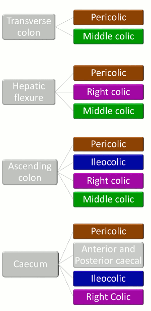 Since T3 tumours extend beyond the muscularis propria and T4 tumours extend beyond the serosa, the anatomical presence or absence of the serosa is important. T3 tumours may extend more than 15 mm beyond the muscularis propria, but if serosa is present close to the muscularis propria, the direct extent as a T3 tumour may be limited, as once the serosa is perforated, the tumour is classified as T4. Parts of the colon that are intraperitoneal are covered with serosa (visceral peritoneum), these are caecum, transverse colon and sigmoid colon and are easily remembered as these are suspended by a mesentery. Visceral peritoneum also covers the ascending and descending colons, but only over their anterolateral surfaces. Posteriorly these structures (beyond their muscularis propria) are covered by adventitia continuous with the retroperitoneum. The rectum is only covered in peritoneum in its midpart anteriorly and upper part anterolaterally. The important boundary in the rectum is the mesorectal fascia as this indicates the circumferential resection margin (CRM, see below).