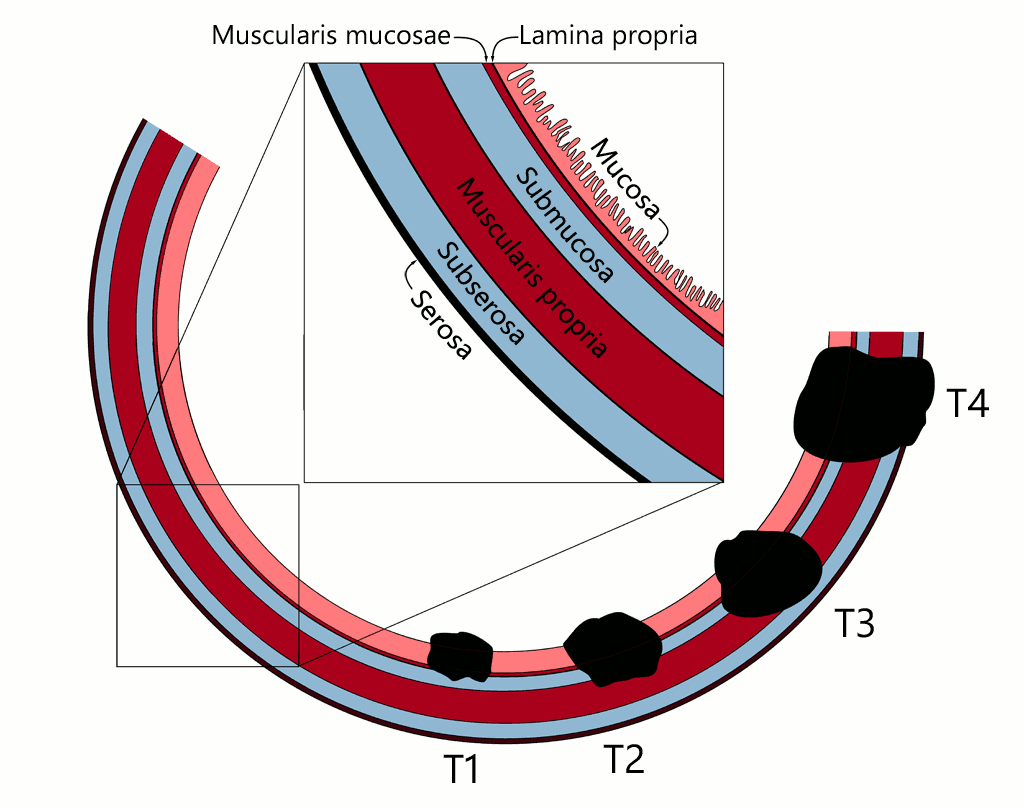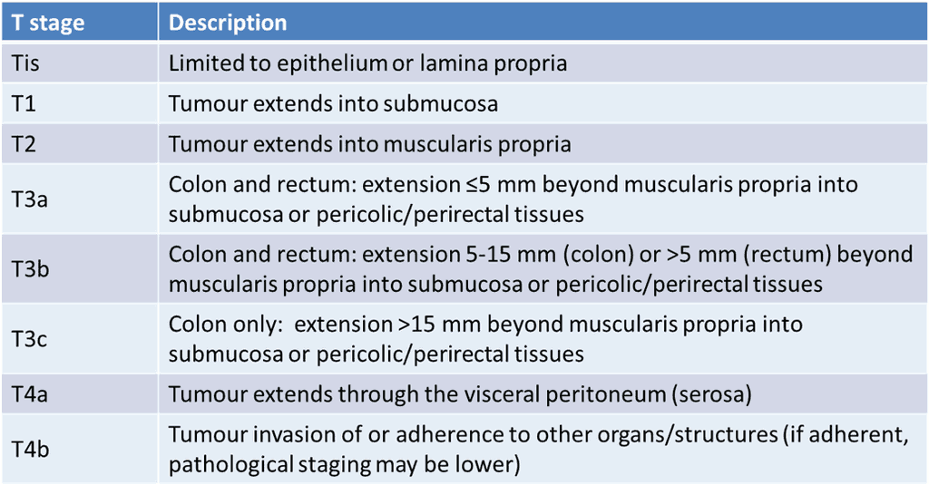 Note that there is no longer a T3d classification for colonic tumours (the 1 mm cut-off has been removed) and now the only T3 subdivisions for rectal tumours are T3a and T3b (only the 5 mm cut-off remains).(3) Also, note that the AJCC has not adopted the T3 subdivision.