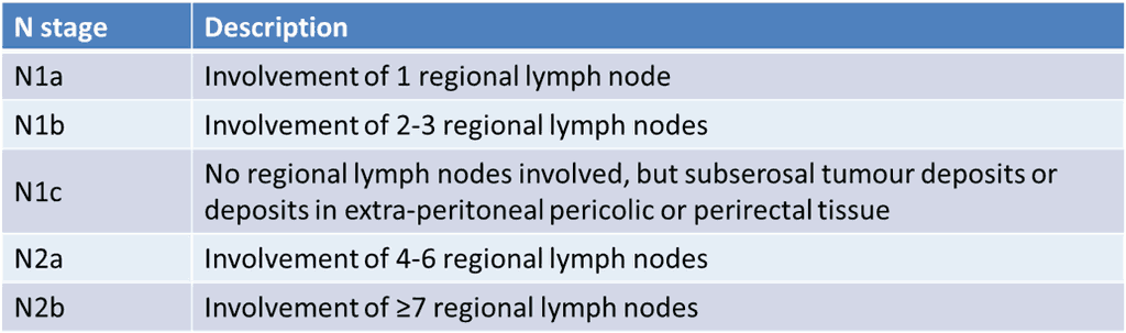Due to the many possible subdivisions and multiple nodal stations, colorectal cancer staging can be daunting. However, whilst important differences in the imaging, anatomy and in the subdivisions (optional) are present, common features mean that the TNM staging of cancers of the colon and the TNM staging of cancers of the rectum are grouped together.