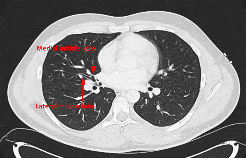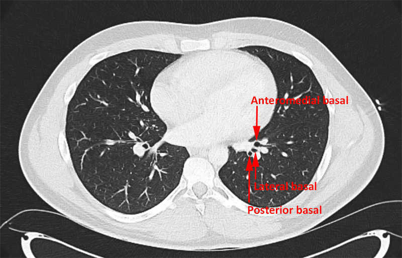 Lower lobe: Apical, posterior basal, anteromedial basal, and lateral-basal.