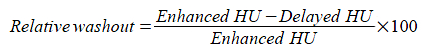Where a lesion cannot be characterised based on the unenhanced Hounsfield unit values, post contrast (at 60 seconds) and delayed (15 minute) scans are required. Using Hounsfield unit measurements from these scans, either the relative or absolute contrast washout can be calculated and used to characterise the lesion.(3,4) Use the calculator above for relative washout when a pre-contrast scan is not available. When a pre-contrast scan is available, use the absolute washout calculator.