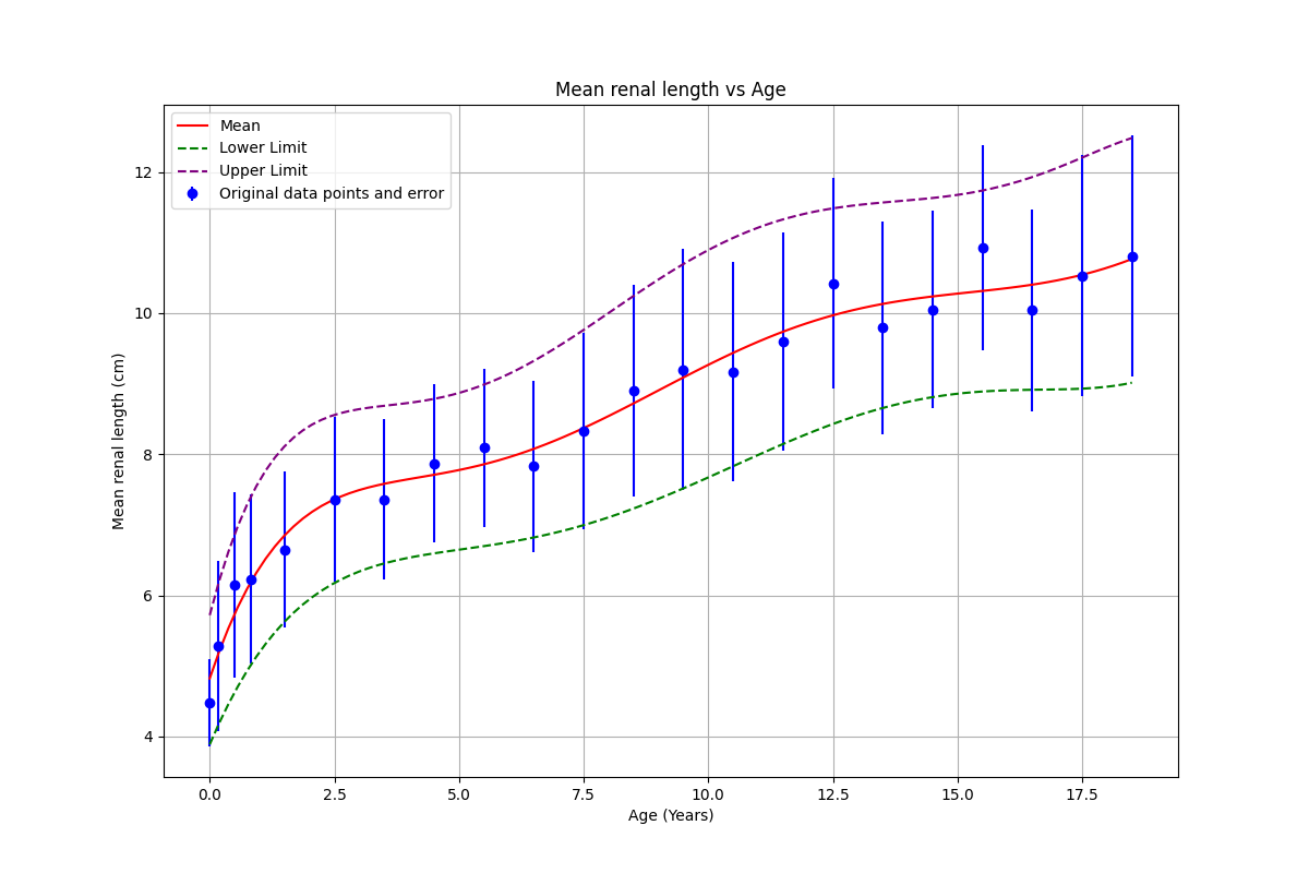 Figure derived from data presented in Rosenabaum et al (1). Polynomial curves have been fitted through data with a three group moving average standard deviation. One of the lowest standard deviations is at birth. This is not congruent with the remaining data and I have chosen not to set the intercept - this way the data conform better with Han and Babcock (2). The data are limited by very small numbers above 16 years of age. The results are only approximate and consideration should be given to adult renal sizes - certainly this tool cannot be used in adults.
